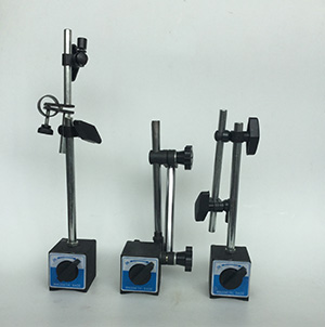 磁性表座也称万向表座。是机器制造业用途较多,广泛适用于各类机床,也是必不可少的检测工具之一,同时还应用于各种科研机构及高等院校的科学研究中测量精度。它里面是一个圆柱体,在其中间放置一条条形的永磁铁,外面底座的位置是一块软磁材料,使用时,通过转动开关来转动里面的磁铁。当磁铁的两极呈上下方向时,软磁材料的底座就被磁化,这个方向上具有强磁性,所以能够吸住钢铁表面。而当磁铁的两极处于水平方向时。两极的中间正对软磁材料的底座时,底座不会被磁化,所以底座上磁力小。就可以轻易地从工作面上取下来。